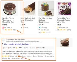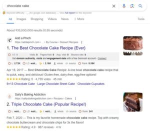 Not only that, but when you peek at the search engine results page (SERP), you notice it’s flooded with recipe blogs and cooking tutorials rather than bakery websites. This suggests that most people searching for “chocolate cake” are seeking recipes, not ready-made cakes.